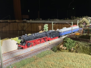 Da in einem Hobbyraum eben nicht unbegrenzt Raum zur Verfügung steht, bietet sich an Module zu bauen und auf FREMO-Treffen zu gehen. Da kommen schon mal an die 30m Fahrstrecke zusammen und es gibt kein schöneres Geräusch, wenn ein langer Zug mit Stakkato an den Modulübergängen über die Strecke donnert. | |