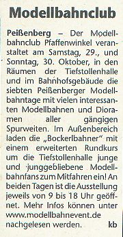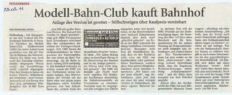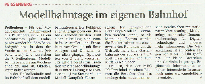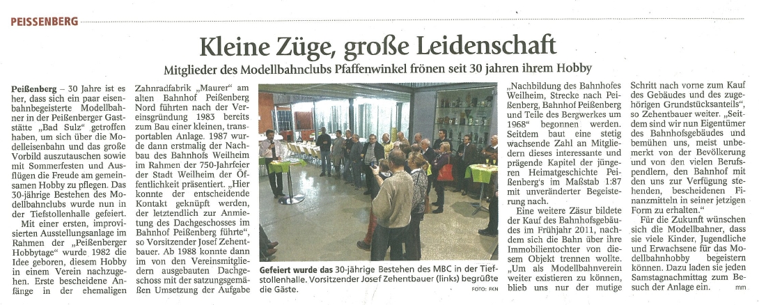 Für das Clublogo des MBC Pfaffenwinkel e. V. wurde bewußt eine Baureihe 50 mit Kabinentender gewählt, da diese die schweren Kohlenganzzüge von Peißenberg in den gesamten süddeutschen Raum brachten. Werdegang:Anfang der 1980er-Jahre existierte im oberbayerischen Peißenberg eine Gruppe begeisterter Modelleisenbahner, welche über den bis dahin betriebenen Stammtisch hinaus den Bau einer eigenen Clubanlage anstrebten. Nach einigen Irrungen und Wirrungen bei der Gründung eines Vereines, insbesondere in der satzungsmäßen Festlegung der Clubaufgabe (Nachbau des Bahnhofes Weilheim sowie der Strecke bis zum Bahnhof Peißenberg und Teilen des ehemaligen Kohle-Bergwerkes Peißenberg) erfolgte am 24.06.1983 die Eintragung im Registergericht des Amtsgerichtes Weilheim (VR 80286). Nach dem Bau einer ersten Kompaktanlage unter schwierigen räumlichen Verhältnissen und Besuchen bei befreundeten Modellbahnvereinen, Ausstellungen, Stadtgründungsjubiläen konnten die erforderlichen Kontakte geknüpft werden um die Anmietung des Dachgeschosses im Bahnhof Peißenberg zu ermöglichen. In unzählig vielen Ausbaustunden mussten dann ab 1988 die räumlichen Voraussetzungen für das neue Clubdomizil geschaffen werden. Seit diesem Zeitpunkt beschäftigt sich der harte Kern der Mitglieder unverdrossen und mit gleichbleibender Freude am Hobby mit dem Bau einer Clubanlage. Nebenbei entstanden auch noch eine ansehnliche Modulanlage in eigener Normung (Süd-Modul) sowie eine Vorführanlage für Elektronikkomponenten der Firma ZIMO. Im Jahr 2011 konnte das Bahnhofsgebäude Peißenberg von der Deutschen Bahn erworben werden. |