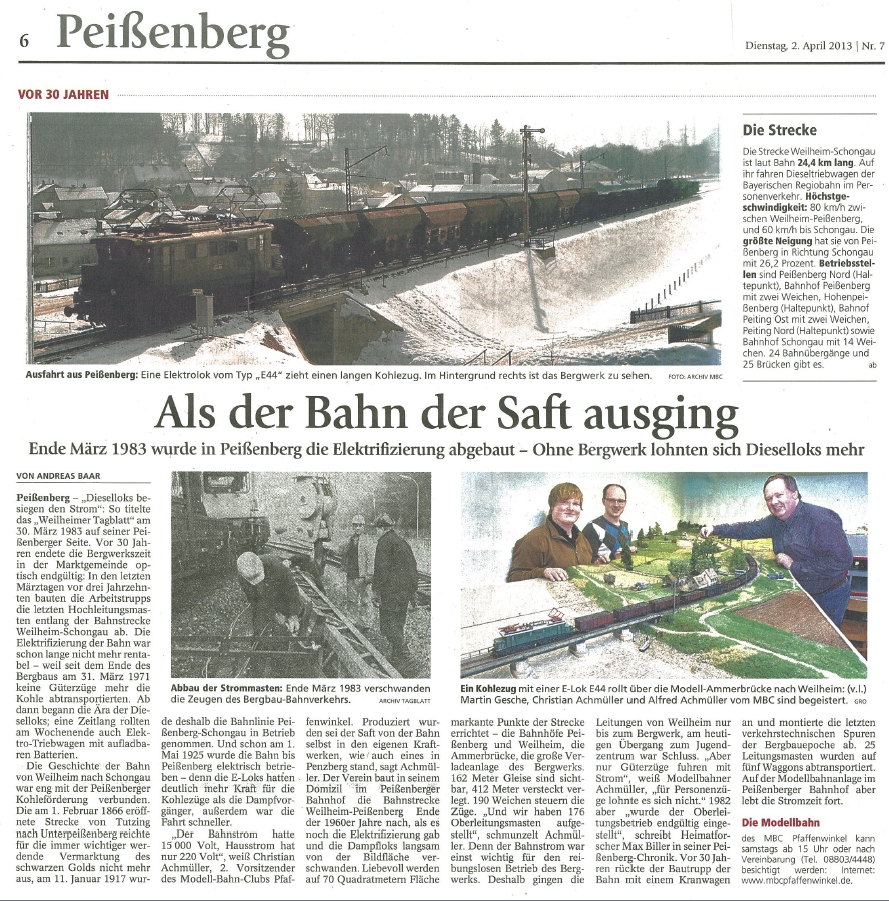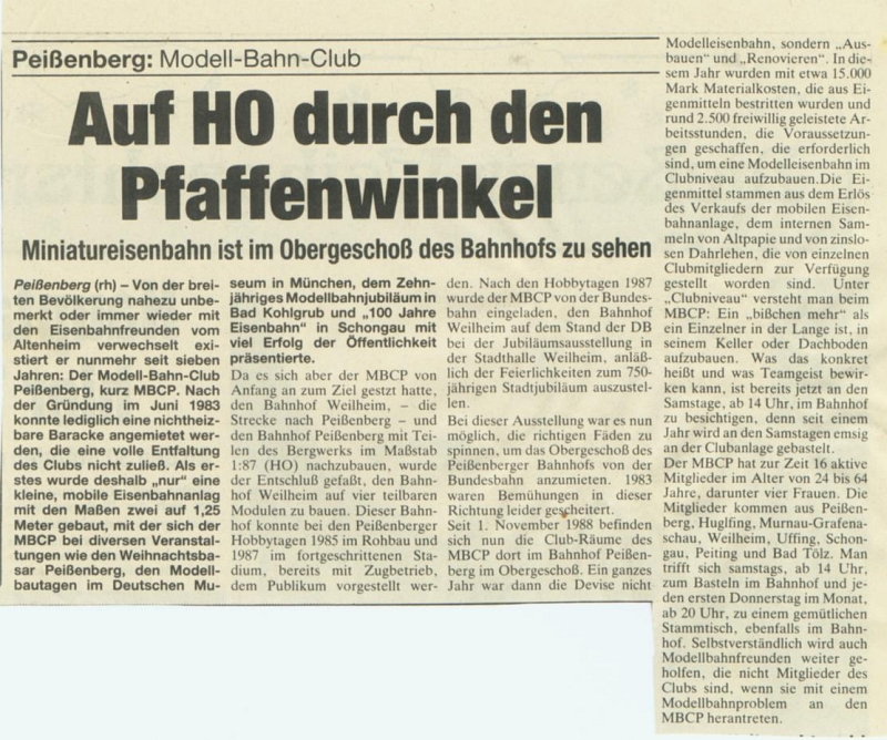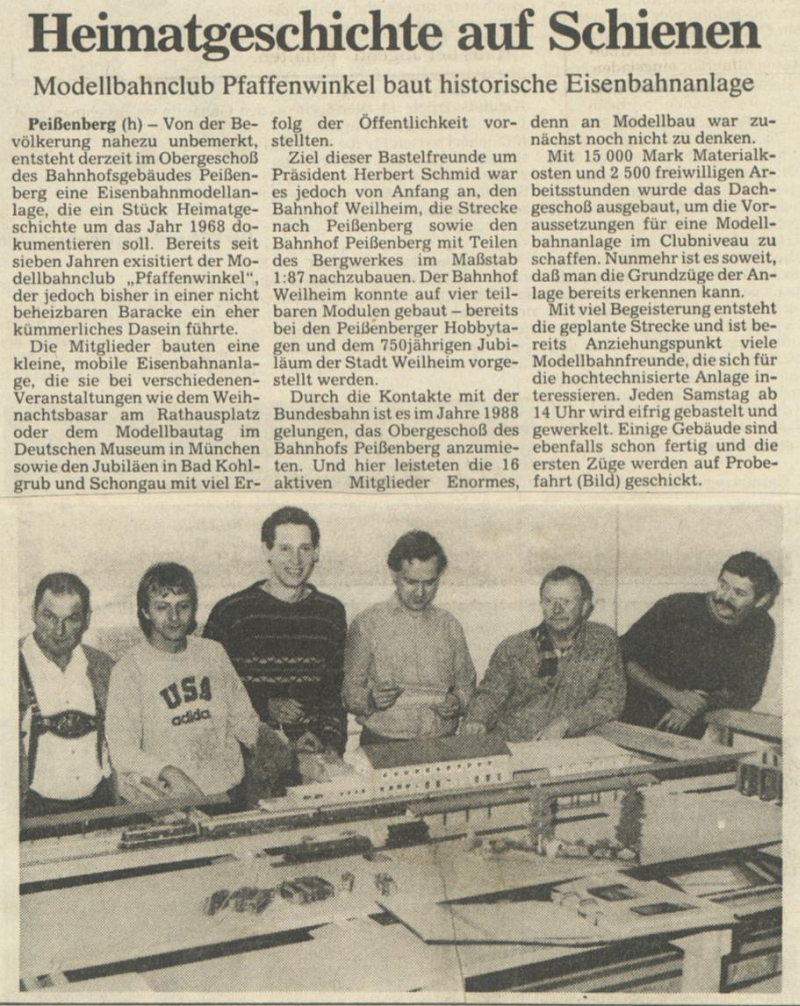 Der MBC Pfaffenwinkel e. V. in Peißenberg/Obb. befasst sich seit seiner Gründung im Jahre 1983 mit dem Aufbau und dem Betrieb einer H0-Modelleisenbahn (2L=); das Thema dieser Anlage ist der möglichst vorbildgerechte Nachbau der Bahnhöfe Weilheim und Peißenberg um 1968 (Epoche 3a). Peißenberg, am Fuße des Hohenpeißenberges etwa 70 km südwestlich von München, war bis ins Jahr 1971 Bergbaustandort. Das Transportaufkommen für die im Untertagebergbau gewonnene Pechbraunkohle wurde größtenteils mittels Schienenverkehr abgewickelt. Gerade dieser Orts- und Epochenbereich bietet die Gelegenheit, ein Stück Heimatgeschichte zu erhalten. Außerdem besaß der Fahrzeugpark der Deutschen Bundesbahn zu jener Zeit die größte Typenvielfalt bei den eingesetzten Lokomotiven und Waggons; so wurden z. B. gleichzeitig Dampf-, Diesel und Elloks eingesetzt.
