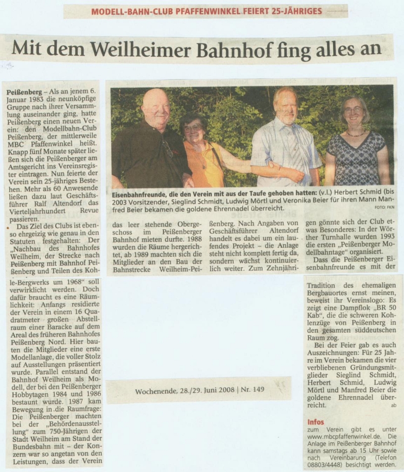 Für das Clublogo des MBC Pfaffenwinkel e. V. wurde bewußt eine Baureihe 50 mit Kabinentender gewählt, da diese die schweren Kohlenganzzüge von Peißenberg in den gesamten süddeutschen Raum brachten. Werdegang:Anfang der 1980er-Jahre existierte im oberbayerischen Peißenberg eine Gruppe begeisterter Modelleisenbahner, welche über den bis dahin betriebenen Stammtisch hinaus den Bau einer eigenen Clubanlage anstrebten. Nach einigen Irrungen und Wirrungen bei der Gründung eines Vereines, insbesondere in der satzungsmäßen Festlegung der Clubaufgabe (Nachbau des Bahnhofes Weilheim sowie der Strecke bis zum Bahnhof Peißenberg und Teilen des ehemaligen Kohle-Bergwerkes Peißenberg) erfolgte am 24.06.1983 die Eintragung im Registergericht des Amtsgerichtes Weilheim (VR 80286). |
